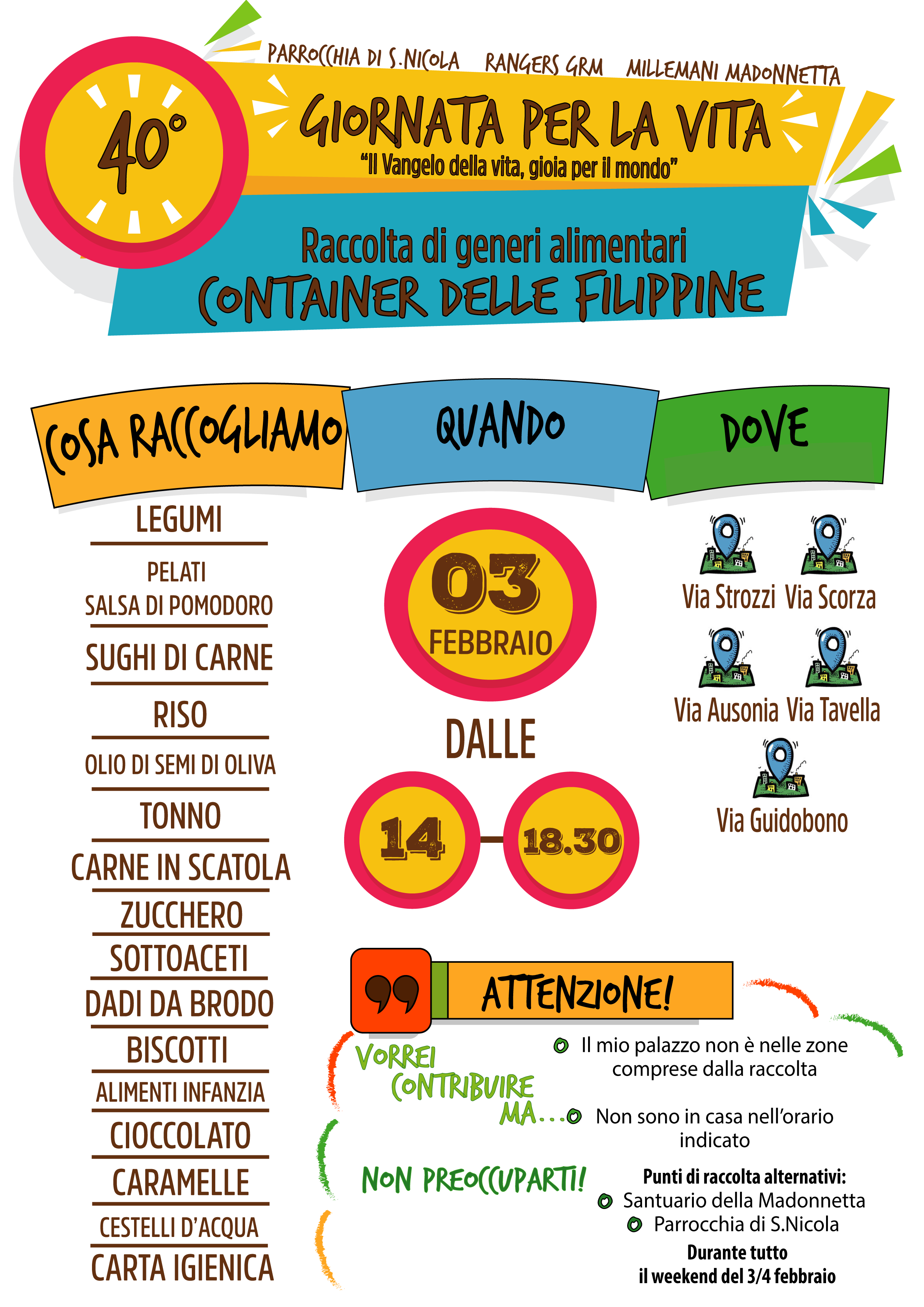 Si comincerà SABATO 3 FEBBRAIO dalle ore 14.00 alle 18.30 con la raccolta di generi alimentari (elenco nel volantino) per le vie del quartiere. Saranno presenti: Rangers GRM, catechismo parrocchiale e Millemani Madonnetta.