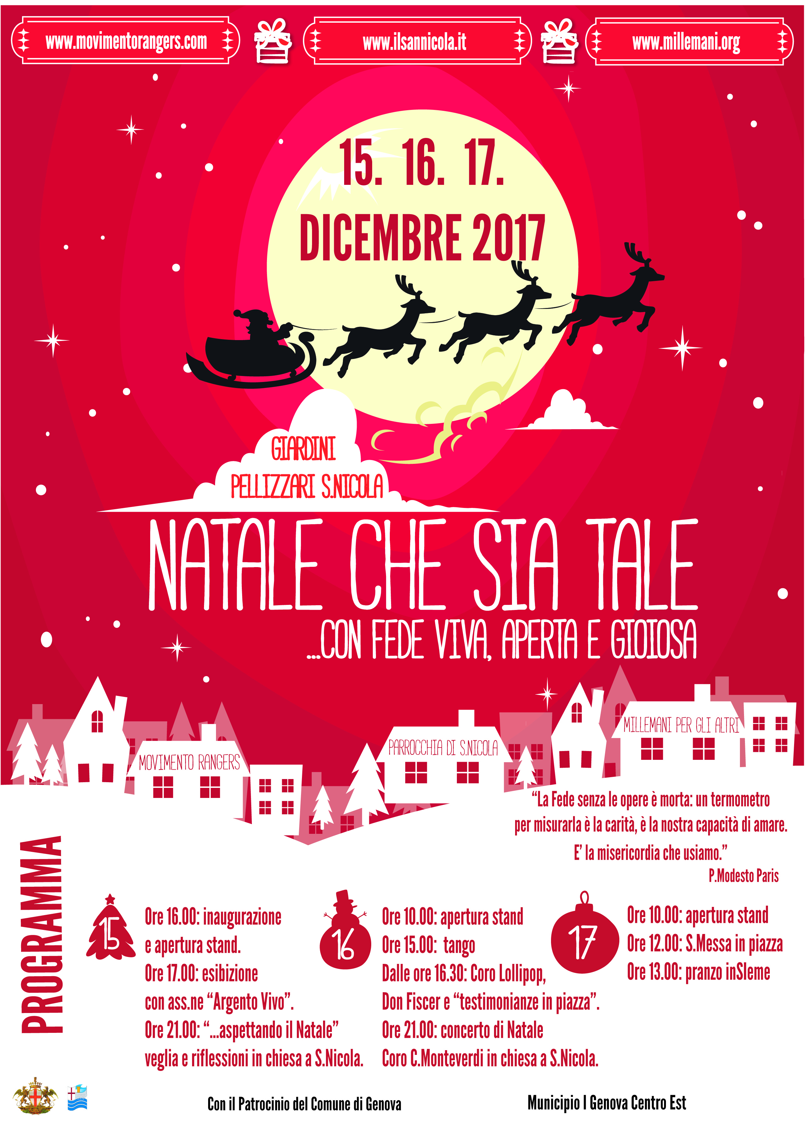 Movimento Rangers, Parrocchia di S.Nicola e Millemani per gli altri vi aspettano dal 15 al 17 dicembre per una nuova edizione di “Natale che sia tale” ai Giardini Pellizzari di S.Nicola (GE), il nat@le solidale a cui abbiamo tolto la “@” del consumismo per lasciare spazio al desiderio di aiutare il prossimo. Tre giorni di stand, associazioni di volontariato, idee regalo, degustazioni presso il nostro punto di ristoro “Bar del Sorriso”, testimonianze, convegni e, per i bambini, arriva Babbo Natale!
