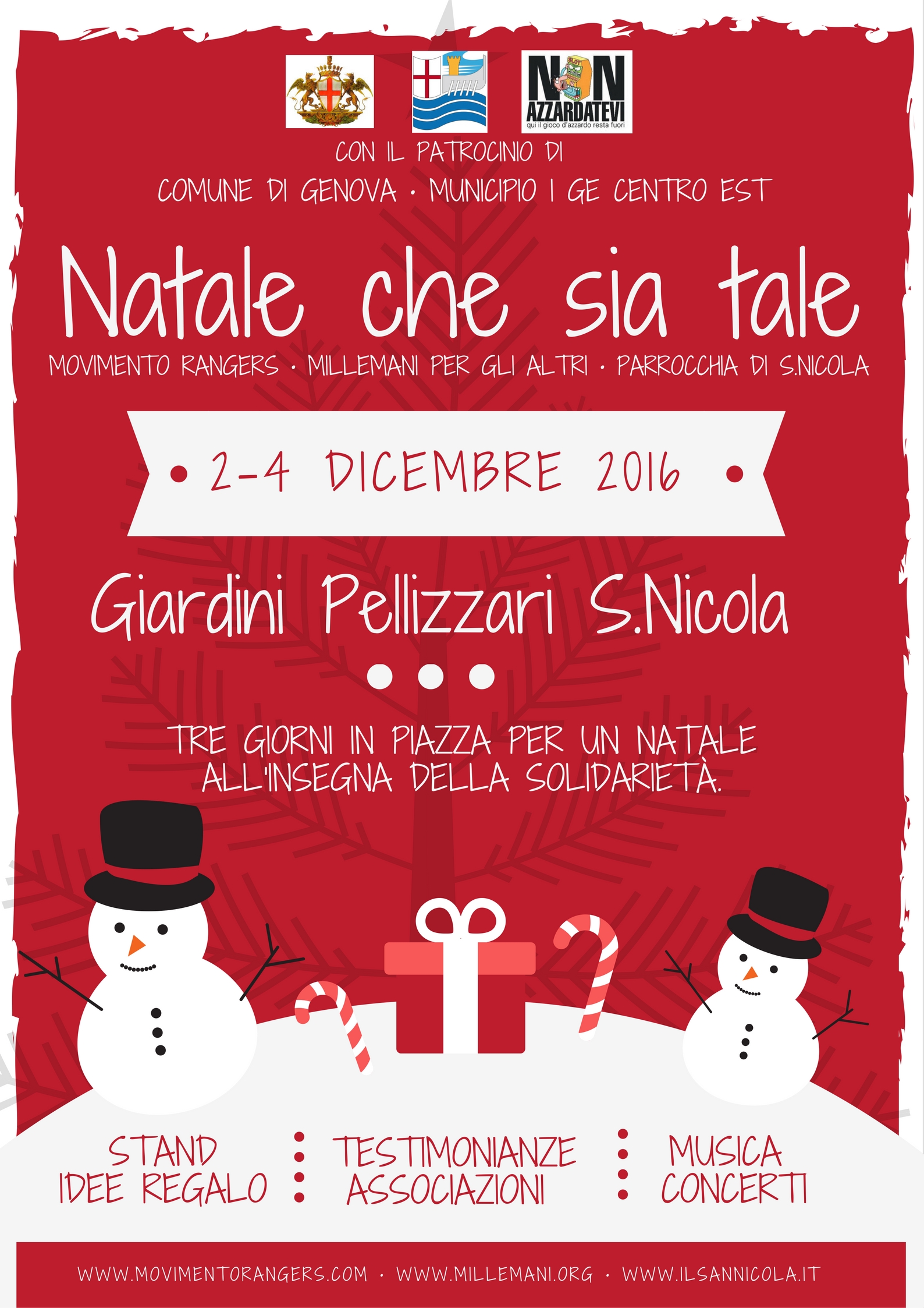 Come di consueto, nel calendario del quartiere di Castelletto, torna l’iniziativa solidale “Nat@le che sia tale” dal 2 al 4 dicembre 2016 ai Giardini Pellizzari di San Nicola (corso Firenze) promossa da Comune di Genova, Municipio I Ge Centro Est ed organizzata dalle associazioni di volontariato Movimento Rangers e Millemani Madonnetta.