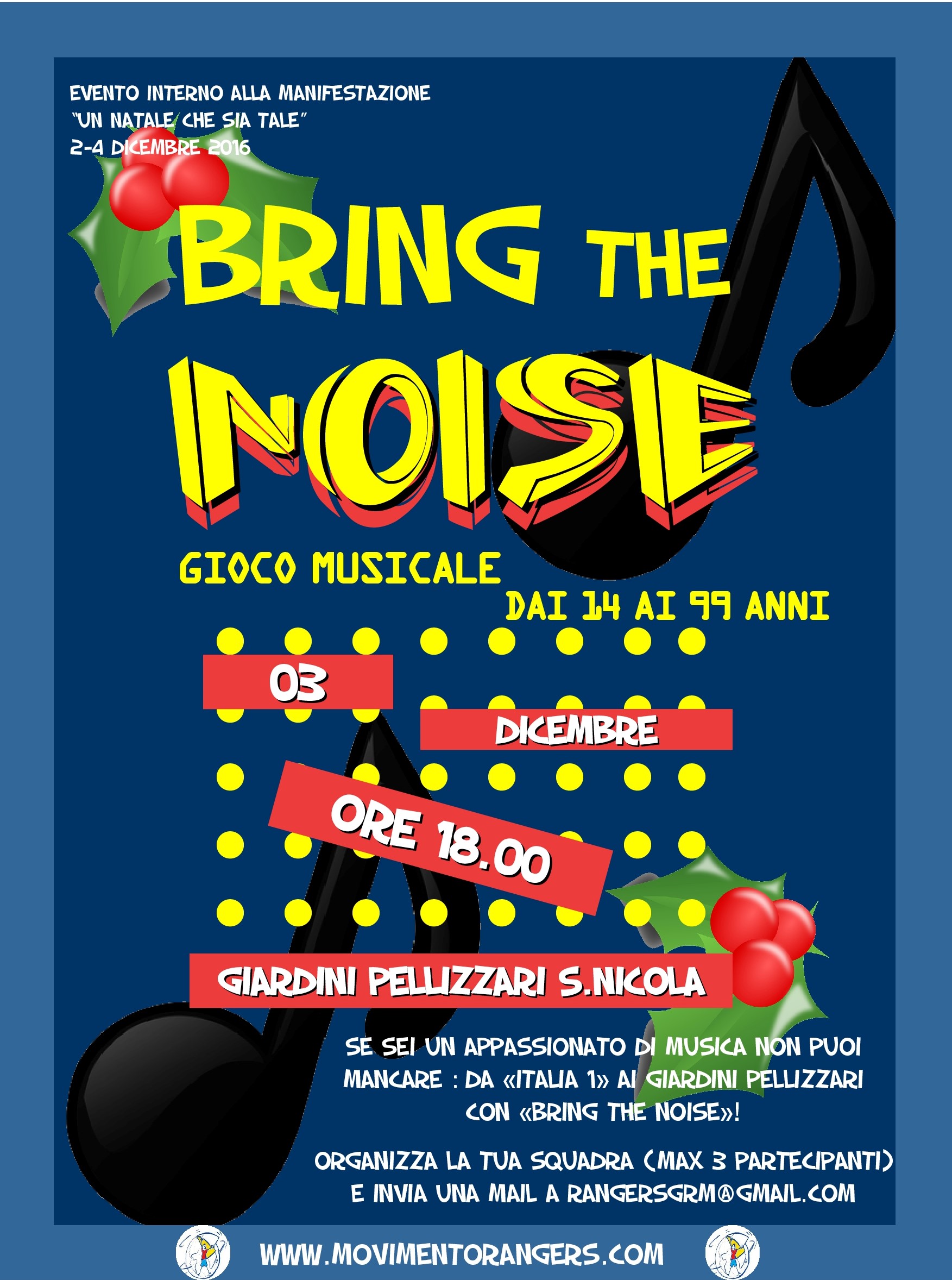 ORE 18.00: “Bring The Noise”. Il famosissimo gioco musicale di «Italia Uno» verrà proposto in piazza, organizzato dai ragazzi del Movimento Rangers! Aperto a tutti: dai 14 ai 99 anni. Basterà formare